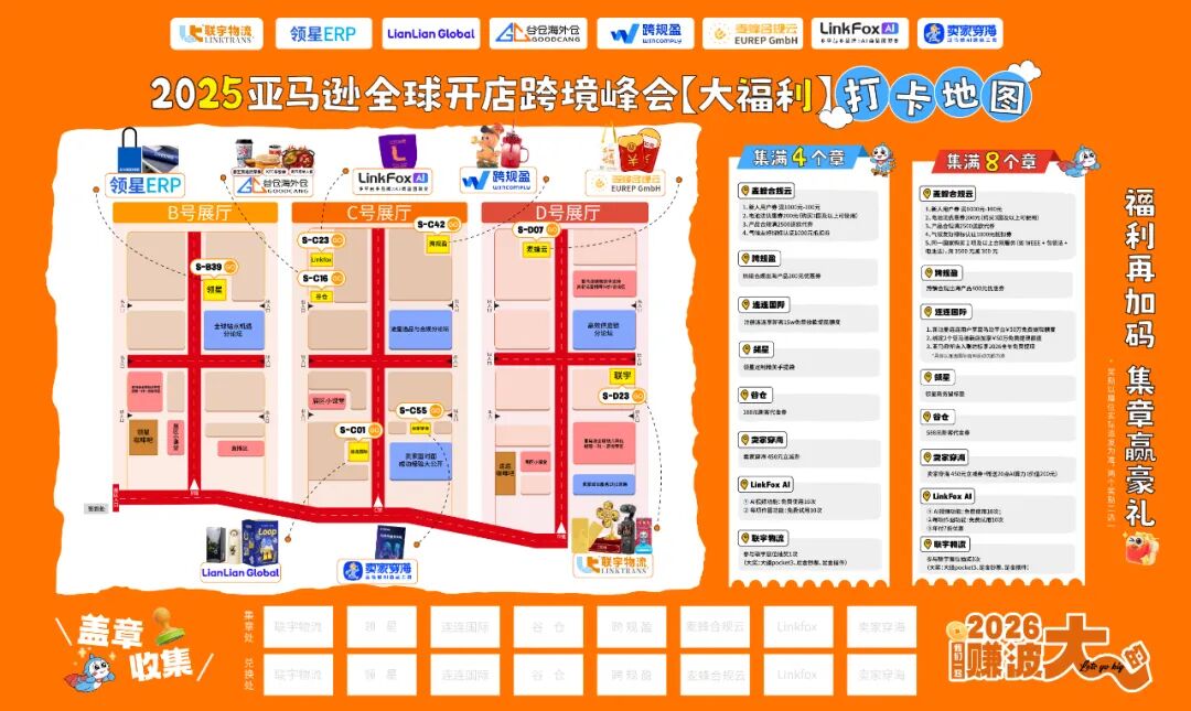 这次,我们不仅准备了新客户专享“真香”大额券、现场幸运大抽奖等常规福利,还组了个“地表最强的跨境福利局”。我们联手领星ERP、连连国际、卖家穿海、谷仓海外仓、跨规盈、麦蜂合规云、紫鸟浏览器这7位生态伙伴,共同打造了「福利打卡地图」活动。