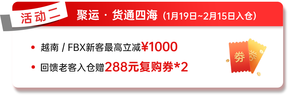 越南渠道老客:活动期首次下单满 1CBM/100KG,解锁 2 张 288 元复购券!