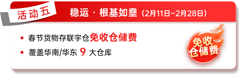 春节备货不用愁,联宇帮你省仓租!2.11-2.28 期间入仓,且 28 日前确定装柜走联宇渠道,直接免收仓租,华南、华东多仓联动: