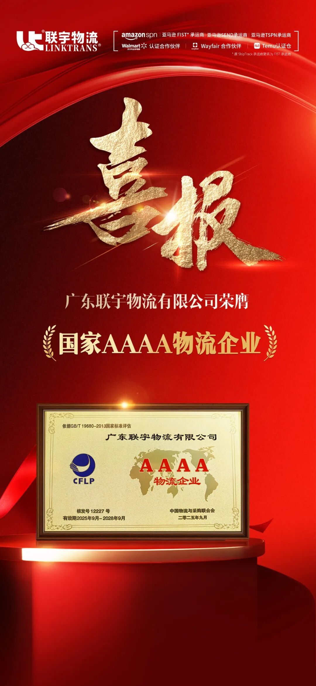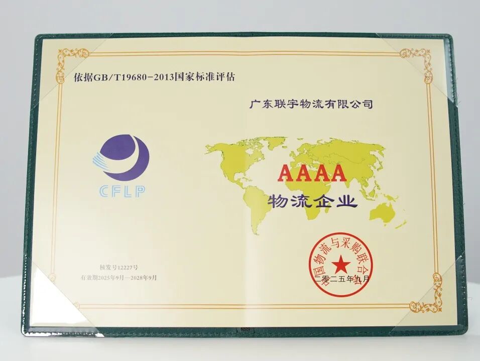 近日,广东联宇物流有限公司凭借卓越的综合实力与完善的服务体系,成功通过中国物流与采购联合会组织的严格评审,被正式授予“国家AAAA级物流企业”称号!