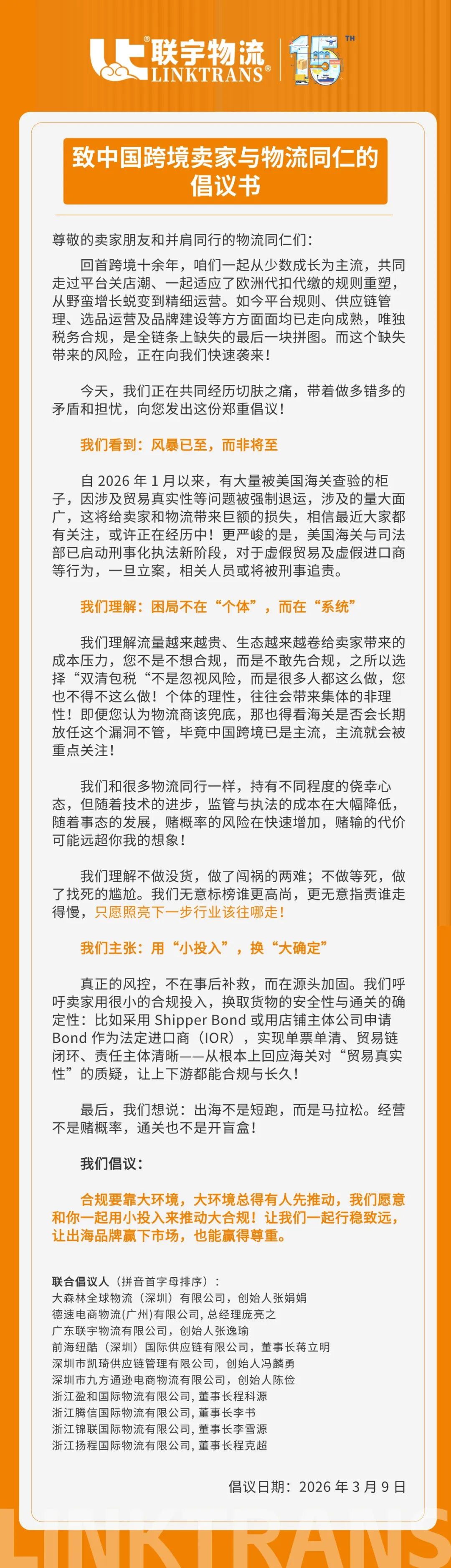 合规不是一个人的事,但每个人的选择,都在塑造行业的未来。诚邀您加入倡议队伍,以规范促发展,以透明赢信任,共同迈向一个更可持续、更健康、更有未来的跨境新物流时代!