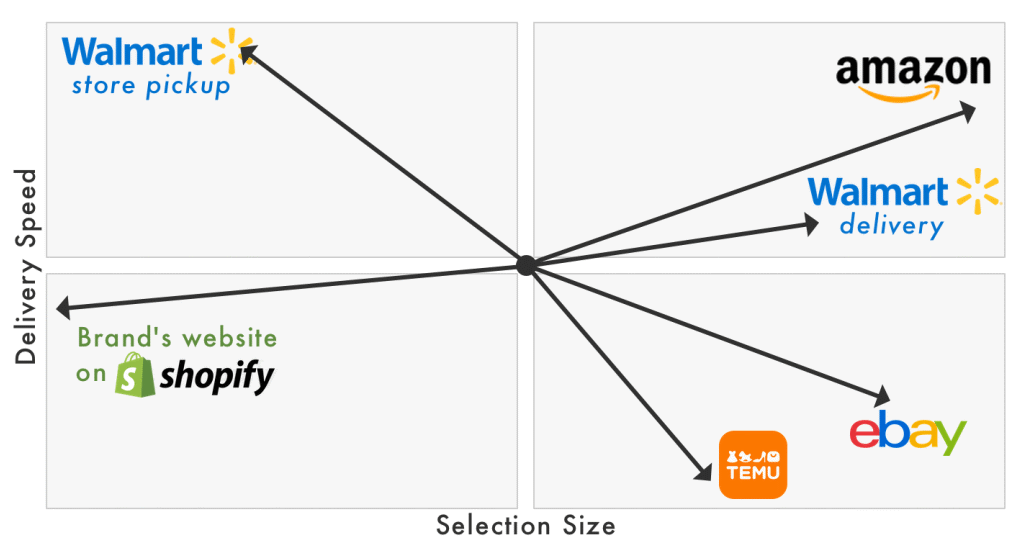 在沃尔玛网上购物有两种体验:一种是快速但选择有限的商店提货,另一种是速度较慢但选择较多的一般电子商务(沃尔玛 50% 的网上订单都是从其一家商店完成的)。Temu和其他中国直邮服务,如阿里速卖通和Shein,选择越来越多,但发货时间超过5天,有时甚至数周。最后,从品牌网站购买有很多优势。但是,这些网站只出售少量商品,因此无法与大型电子商务平台相比。