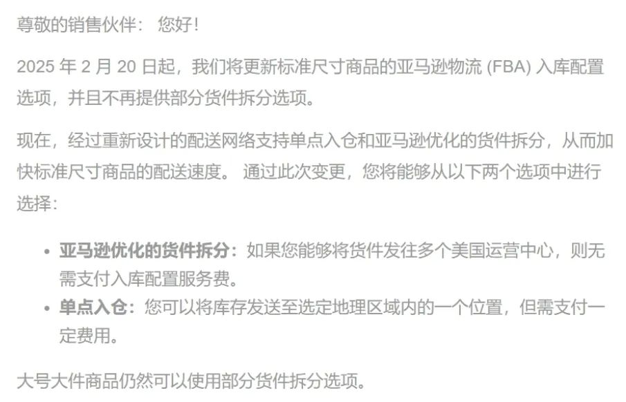 根据亚马逊官方通知显示:2025年2月20日起,亚马逊物流将针对标准尺寸商品的入库配置服务进行调整:取消标准尺寸商品的部分货件拆分选项,优化整合为亚马逊优化的货件拆分与最低货件拆分两种入库选项,您依然能为最低货件拆分选择入库区域(美西,美中或美东),继续保留大件商品的部分货件拆分选项。