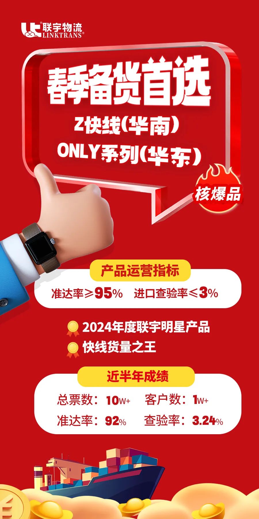 提高销量预测的精准度,通过优化库存管理、供应商管理等方式,避免多仓备货导致的滞销风险。联宇物流明星产品·快线货量之王Z快线和ONLY系列,抢跑市场,快至18天签收;库存无忧,让卖家的供应链更可控;性价比高,为卖家节省额外成本。